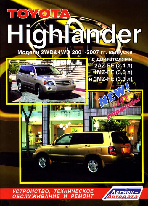 Значительно дополненное справочное пособие Руководство по ремонту Toyota Highlander, а также руководство по эксплуатации и техническому обслуживанию, устройство переднеприводных и полноприводных автомобилей Toyota Highlander 2001-2007 гг. выпуска (2WD & 4WD), оборудованных бензиновыми двигателями 2AZ-FE (2,4 л), 1M2-FE (3,0 л) и 3MZ-FE (3,3 л). Ремонт Тойота Хайлендер. Инструкция по эксплуатации. Электросхемы.