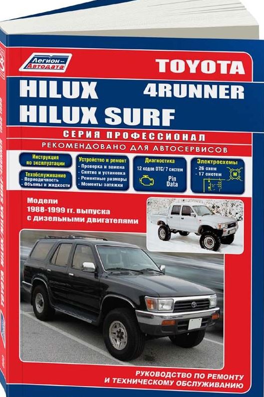 Справочное руководство по ремонту Тойота Хайлюкс Серф Тойота 4-Раннер, Хайлюкс, пособие по эксплуатации и техническому обслуживанию автомобилей Toyota 4-Runner, Hilux, Hilux Surf 1988-1999 гг. выпуска, оборудованных дизельными двигателями 2L (2,4 л.), 3L (2,8 л.), 2L-T (2,4 л. с турбонаддувом), 2L-TE (2,4 л. с турбонаддувом и электронной системой управления двигателем), 1KZ-T (3,0 л. с турбонаддувом) и 1KZ-TE (3,0 л. с турбонаддувом и электронной системой управления двигателем). Ремонт Тойота Хайлюкс Сурф. Эксплуатация, техническое обслуживание, диагностика и устройство. Схемы электрических соединений.