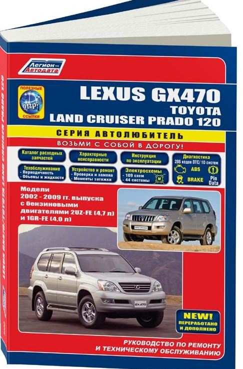 Руководство по ремонту, устройству, эксплуатации и техническому обслуживанию автомобилей Toyota Land Cruiser 120 Prado с 2002 г. выпуска, оборудованных бензиновыми двигателями 1GR-FE рабочим объемом 4,0 л. и 2UZ-FE рабочим объемом 4,7 л. Ремонт узлов и агрегатов Тойота Ленд Крузер 120. Каталог расходных запчастей. Устройство. Эксплуатация. Диагностика неисправностей. ТО. Схемы электрических соединений.