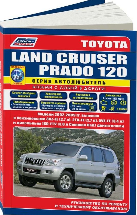 Информационно-справочное руководство по ремонту Тойота Прадо 120, руководство по эксплуатации и техническому обслуживанию автомобилей Тойота Прадо 120 120 с 2002 г. выпуска, оборудованных бензиновыми двигателями 3RZ-FE, 2TR-FE рабочим объемом 2,7 л., 5VZ-FE рабочим объемом 3,4 л., дизельными двигателями 1KD-FTV рабочим объемом 3,0 л. Ремонт узлов и агрегатов Тойота Прадо 120. Эксплуатация. ТО. Устройство. Неисправности. Диагностика. Электрические схемы.