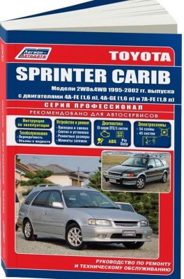 Справочно-информационная книга Руководство по ремонту Toyota Sprinter Carib и руководство по эксплуатации и техническому обслуживанию Toyota Sprinter Carib, устройство полноприводных и переднеприводных праворульных автомобилей Toyota Sprinter Carib 1995-2001 гг. выпуска, оборудованных двигателями 4A-FE (1,6 л.), 4A-GE (1,6 л.) и 7A-FE (1,8 л.). Модели 2WD и 4WD. Инструкция по ТО и эксплуатации. Устройство, диагностика, электрические схемы.