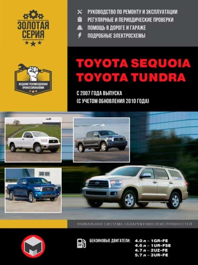 Справочное иллюстрированное подробное издание инструкция по ремонту Toyota Tundra, Toyota Sequoia. Также в книге рассмотрено устройство Toyota Tundra, Toyota Sequoia, представлено руководство по эксплуатации и техобслуживанию Toyota Tundra, Toyota Sequoia, которые производятся с 2007 года, а также обновленные модели 2010 года выпуска. Оснащаются модели бензиновыми моторами рабочим объемом 4,0, 4,6, 4,7, 5,7 л. Тип двигателей 1GR-FE / 1UR-FSE / 2UZ-FE / 3UR-FE, мощность 236 / 276 / 381 л.с. Ремонт Тойота Тундра. Рекомендации по эксплуатации и ТО. Помощь в дороге и гараже. Система определения неисправностей. Электрические схемы.