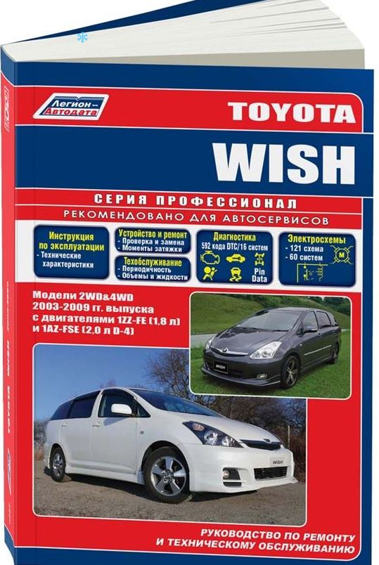 Справочно-информационное подробнейшее иллюстрированное издание Руководство по ремонту Toyota Wish, а также руководство по эксплуатации и техническому обслуживанию Toyota Wish, устройство переднеприводных и полноприводных автомобилей Toyota Wish, а также каталог запчастей Toyota Wish 2003-2009 годов выпуска. Модель Тойота Виш оборудована бензиновыми двигателями 1ZZ-FE (1,8 л.) и 1AZ-FSE (2,0 л. D-4). Ремонт Тойота Виш. Эксплуатация, обслуживание, устройство, электрические схемы.