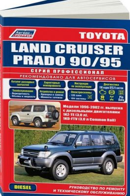 Руководство по ремонту, эксплуатации и техническому обслуживанию автомобиля Toyota Land Cruiser Prado 90 1996-2002 гг. выпуска с левосторонним и правосторонним рулевым управлением, оборудованных дизельными двигателями с турбонаддувом и электронным управлением 1KZ-TE (3,0 л) и 1KD-FTV NEW! (3,0 л Common Rail). Ремонт Тойота Лендкрузер 90. Инструкция по эксплуатации. Техобслуживание. Каталог расходных запчастей. Устройство. Диагностика. Схемы электрических соединений.