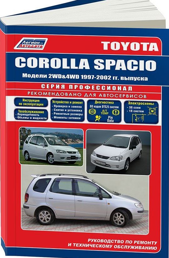 Инструкция по ремонту Toyota Corolla Spacio, инструкция по эксплуатации и техническому обслуживанию переднеприводных и полноприводных автомобилей Toyota Corolla Spacio 1997-2002 гг. выпуска, оборудованных бензиновыми двигателями 4A-FE (1,6 л.) и 7A-FE (1,8 л.). Модели 2WD & 4WD. Ремонт Тойота Королла Спасио. Эксплуатация, ТО, устройство, диагностика, схемы электрических соединений.