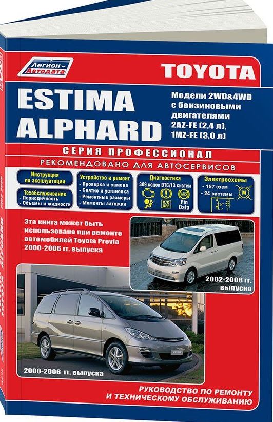 Максимально насыщенное справочное пособие Руководство по ремонту Toyota Estima / Toyota Alphard, а также руководство по эксплуатации и техническому обслуживанию, устройство переднеприводных и полноприводных автомобилей Toyota Estima 2000-2006 / Alphard 2002-2008 гг. выпуска (2WD & 4WD), оборудованных бензиновыми 2AZ-FE (2,4 л) и 1MZ-FE (3,0 л) двигателями. Книга также может быть использована при ремонте автомобилей Toyota Previa 2000-2006 гг. выпуска. Ремонт Тойота Эстима. Инструкция по эксплуатации. Электросхемы. Техническое обслуживание. Диагностика неисправностей.