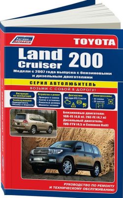 Подробнейшее, со множеством иллюстраций, справочно-информационное издание Руководство по ремонту Тойота Ленд Крузер 200, устройство Тойота Ленд Крузер 200, руководство по эксплуатации и техническому обслуживанию Тойота Ленд Крузер 200 с 2007 г. выпуска. Модель оборудуется бензиновыми двигателями 1GR-FE и 2UZ-FE рабочим объемом 4,0 и 4,7 л. и дизелем 1VD-FTV объемом 4,5 л. Common Rail. Ремонт Toyota Land Cruiser 200. Устройство, эксплуатация, ТО, диагностика. Схемы электрических соединений.