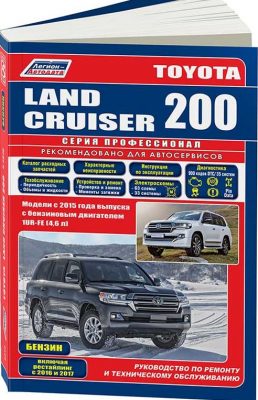 Подробнейшее, со множеством иллюстраций, справочно-информационное издание Руководство по ремонту Тойота Ленд Крузер 200, устройство Тойота Ленд Крузер 200, инструкция по эксплуатации и техническому обслуживанию Тойота Ленд Крузер 200 с 2015 г. выпуска (рестайлинги 2016 и 2017 годов учтены). В книге описываются модели оборудованные бензиновыми двигателями 1UR-FE рабочим объемом 4,6 л.