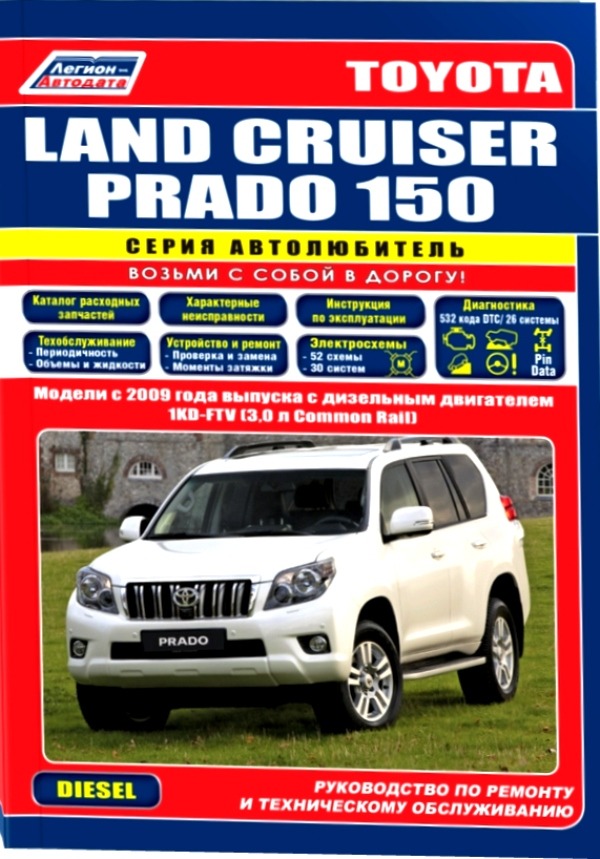 Иллюстрированная книга по ремонту Toyota Land Cruiser Prado 150, каталог расходных запасных частей, а также инструкция по техническому обслуживанию и эксплуатации автомобилей Тойота Ленд Круизер Прадо 150 с 2009 года выпуска. Модели оснащены дизельными двигателями 1KD-FTV (3,0 л Common Rail). Ремонт узлов и агрегатов. Эксплуатация. ТО. Электрические схемы. Диагностика неисправностей.