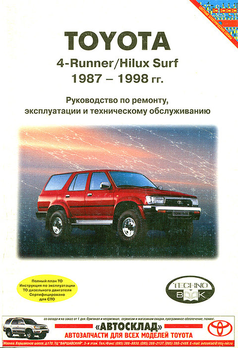 Справочное иллюстрированное издание книга по ремонту Toyota 4Runner / Toyota Hilux Surf, устройство моделей, руководство по эксплуатации и техническому обслуживанию Toyota 4Runner / Toyota Hilux Surf, которые выпускались с 1987 по 1998 годы.