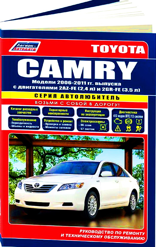 Справочно-информационное иллюстрированное пособие Руководство по ремонту Тойота Камри, устройство Тойота Камри, пошаговое руководство по эксплуатации и техническому обслуживанию Тойота Камри с 2006 г. выпуска, оборудованных бензиновыми двигателями 2AZ-FE и 2GR-FE рабочим объемом 2,4 и 3,5 л. соответственно. Описание неисправностей. Каталог расходных запчастей. Рекомендации по эксплуатации и ТО. Ремонт узлов и агрегатов. Схемы электрооборудования.