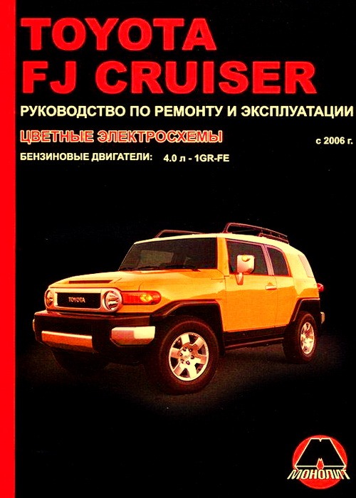Инструкция по эксплуатации Toyota FJ Cruiser, сведения о том, как осуществить необходимое регулярное техобслуживание своими руками, указания и рекомендации о его грамотном производстве, цветные и подробные схемы электрических соединений (электросхемы) машины можно найти в отдельных разделах этого пособия. Также книга поможет подобрать запчасти Toyota FJ Cruiser.
