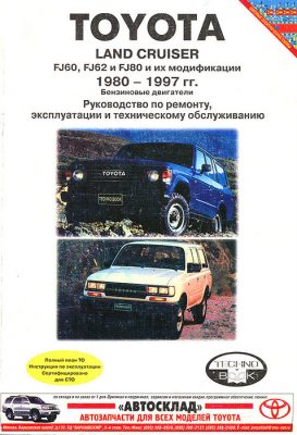 Справочное иллюстрированное пособие книга по ремонту Тойота Ленд Крузер FJ60, FJ62, FJ80, устройство автомобилей, руководство по эксплуатации и техническому обслуживанию Тойота Ленд Крузер и модификаций модели, предназначенных как для Европы, так и для стран Америки и Азиатского региона. Toyota Land Cruiser FJ60, FJ62, FJ80 выпускались с 1980 до 1997 года и оснащались бензиновыми двигателями 3F-E (4,0 л.), 2F (4,2 л.), 1FZ-FE (4,5 л.).
