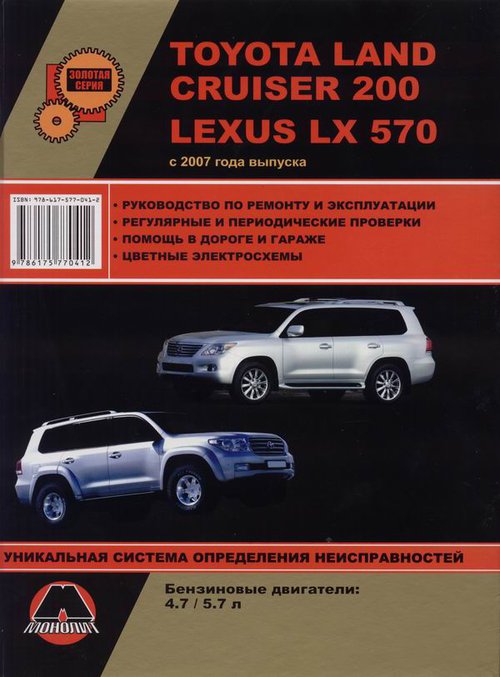 Справочно-информационное подробнейшее иллюстрированное издание Руководство по ремонту Toyota Land Cruiser 200, Lexus LX 570, а также устройство, руководство по эксплуатации и техническому обслуживанию Toyota Land Cruiser 200, Lexus LX 570. Модели выпускаются с 2007 года, оборудуются бензиновыми двигателями рабочим объемом 4,7 и 5,7 л.