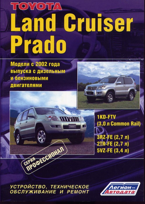 Подробнейшее профессиональное справочно-информационное руководство по ремонту Тойота Крузер Прадо 120, руководство по эксплуатации, устройству и техническому обслуживанию леворульных и праворульных автомобилей Toyota Cruiser Prado 120 с 2002 г. выпуска, оборудованных бензиновыми двигателями 3RZ-FE (2,7 л.), 2TR-FE (2,7 л.), 5VZ-FE (3,4 л.) и дизельным двигателем 1KD-FTV (3,0 л. Common Rail).