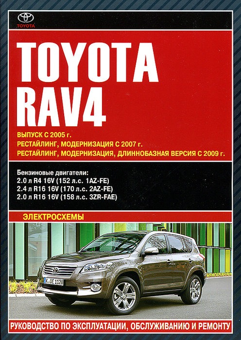 Справочное иллюстрированное пособие Инструкция по ремонту Toyota RAV4, а также руководство по эксплуатации и техническому обслуживанию Toyota RAV4, устройство Toyota RAV4 с 2005 года выпуска, модернизированной модели Тойота РАВ4 рестайлинг в 2007 году и рестайлинговой, модернизированной версии с длинной базой 2009 года, оборудованных бензиновыми двигателями рабочим объемом 2,0 и 2,4 л.