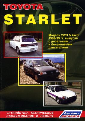 Справочное иллюстрированное издание Руководство по ремонту Toyota Starlet, а также руководство по эксплуатации и техническому обслуживанию, устройство праворульных и леворульных автомобилей Toyota Starlet, модели 2WD & 4WD 1989-1999 гг. выпуска, с дизельным 1N (1,5 л.) и бензиновыми 1E (1,0 л.), 2E, 4E-F, 4E-FE (1,3 л.), 4E-FTE (1,3 л. с турбонаддувом) двигателями.