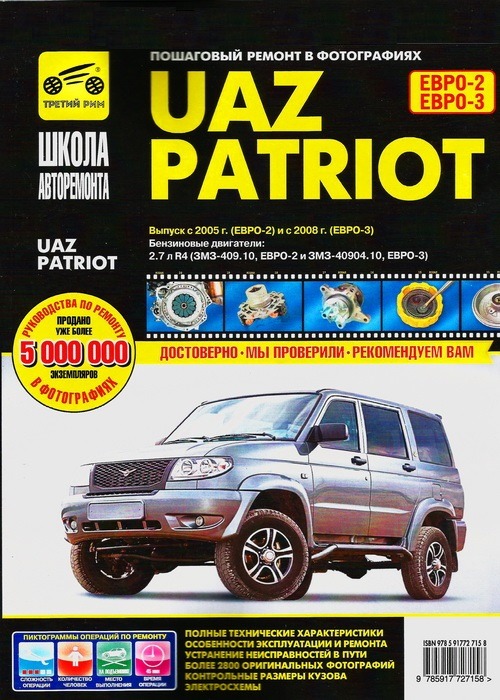 Справочно-информационное издание Руководство по ремонту УАЗ Патриот с 2005 по 2012 г. выпуска, руководство по эксплуатации и техническому обслуживанию УАЗ Патриот, устройство УАЗ 3163 Патриот, оборудованных бензиновым двигателем ЗМЗ-409 (Евро 2, Евро 3). Справочное пособие по ремонту первой модели UAZ Patriot. Пошаговый ремонт узлов и агрегатов. Рекомендации по эксплуатации и ТО. Фотографии. Цветные электросхемы.