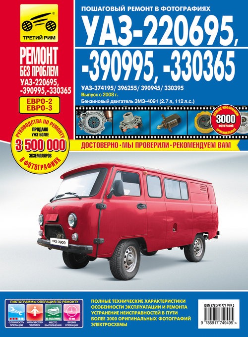 Иллюстрированное в цвете справочно-информационное издание руководство по ремонту УАЗ-3909 (УАЗ Фермер, УАЗ Буханка), УАЗ-2206, УАЗ-220695, УАЗ-390995, УАЗ-330365, УАЗ-452 и их модификаций, руководство по эксплуатации и техническому обслуживанию УАЗ-3909, УАЗ-220695, УАЗ-390995, УАЗ-330365, устройство УАЗ-3909, УАЗ-220695, УАЗ-390995, УАЗ-330365 с 2008 г. выпуска, оборудованных бензиновыми двигателями ЗМЗ-4091 рабочим объемом 2,7 л. (112 л.с.). Руководство включает в себя более 3000 оригинальных цветных фотографий, максимально и в подробностях отображающих весь процесс пошагового ремонта техники. Ремонт УАЗ 3909 (Фермер, Буханка). Цветные фотографии. Устройство. Эксплуатация. ТО. Схемы электрических соединений.