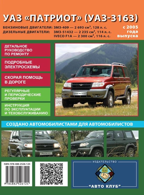 Руководство по ремонту УАЗ 3163 Патриот с 2005 г. выпуска, оборудованных бензиновыми двигателями ЗМЗ 409 рабочим объемом 2,7 литра, мощностью 128 л.с., а также дизельными двигателями ЗМЗ 51432, Iveco F1A рабочим объемом 2,2, 2,3 литра, мощностью 114 и 116 л.с. Ремонт узлов и агрегатов. Инструкция по эксплуатации и ТО. Электросхемы.