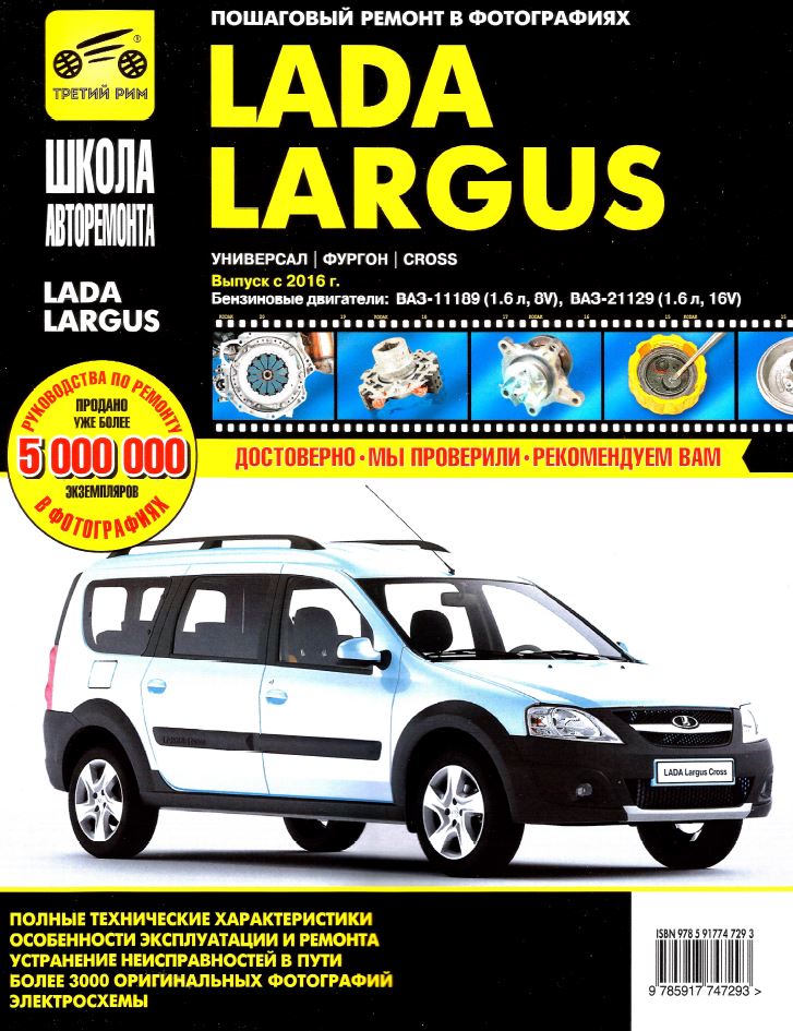 Руководство по ремонту Лада Ларгус-2, книга по обслуживанию, инструкция по эксплуатации Lada Largus-2 с 2016 г. выпуска, с кузовами универсал фургон и Cross, оборудованые бензиновыми двигателями ВАЗ-11189 рабочим объемом 1,6 литра, ВАЗ 21129, рабочим объемом 1,6 литра.