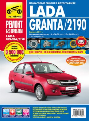 Цветное справочно-информационное пособие руководство по ремонту Лада Гранта / ВАЗ 2190, а также руководство по эксплуатации и техобслуживанию Лада Гранта / ВАЗ 2190, ВАЗ 2191, устройство Лада Гранта / ВАЗ 2190 с 2011 г. выпуска (седан), и с 2014 г. выпуска (лифтбек), оборудованных бензиновыми силовыми агрегатами рабочим объемом 1,6 л. 8V (80 л.с.), 1,6 л. 8V (87 л.с.), 1,6 л. 16V (98 л.с.). Пошаговый ремонт Lada Granta. Эксплуатация, техобслуживание, электрические схемы. Цветные фотографии.