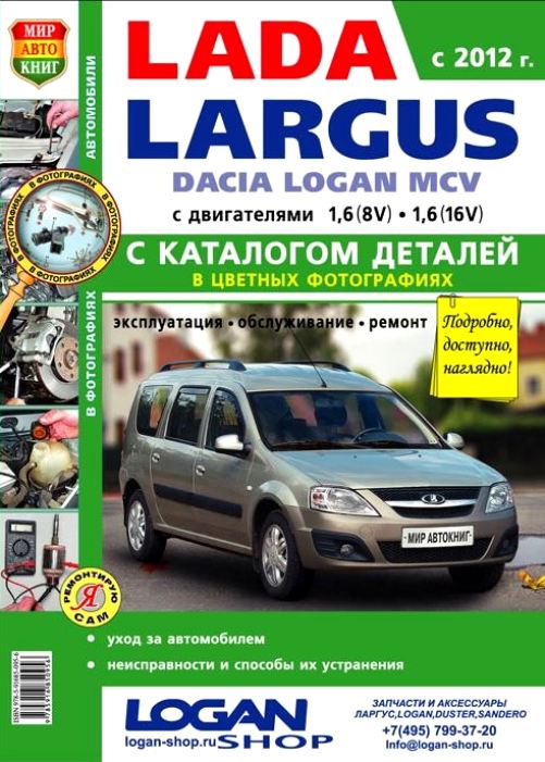 Иллюстрированная цветными фотографиями книга по ремонту Lada Largus / Dacia Logan MCV, а также инструкция по техническому обслуживанию и эксплуатации автомобилей Лада Ларгус / Дача Логан МСВ с 2012 года выпуска, оборудованных двигателями 1,6 л. (8V / 16 V). Каталог запасных частей.