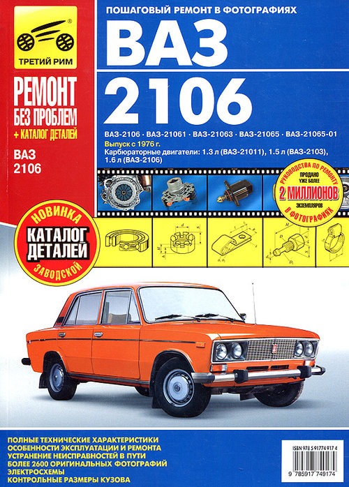 Цветное справочно-информационное пособие Руководство по ремонту VAZ 2106, а также руководство по техническому обслуживанию и эксплуатации, устройство VAZ 2106, VAZ 21061, VAZ 21063, VAZ 21065, VAZ 21065-01, каталог запчастей ВАЗ 2106, каталог деталей и сборочных единиц моделей с 1976 г. выпуска, оборудованных карбюраторными двигателями рабочим объемом 1,3 (ВАЗ-21011), 1,5 (ВАЗ-2103), 1,6 л. (ВАЗ-2106).