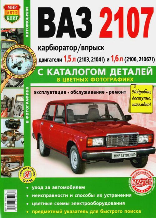 Справочно-информационное, цветное, в фотографиях Руководство по ремонту VAZ 2107, инструкция по эксплуатации и техническому обслуживанию ВАЗ 2107 + каталог деталей ВАЗ 2107. Издание рассказывает об автомобилях, на которые установлены двигатели ВАЗ-2103 рабочим объемом 1,5 л., ВАЗ-2106 (1,6 л.), ВАЗ-2104i (1,5 л.), ВАЗ-21067i (1,6 л.).