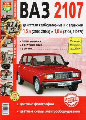 Универсальное, с цветными фотографиями, пособие по ремонту ВАЗ 2107, устройство, инструкция по эксплуатации и техническому обслуживанию автомобилей ВАЗ 2107, оборудованных карбюраторными двигателями и двигателями с впрыском рабочим объемом 1,5 л (2103, 2104i) и 1,6 л (2106, 21067i). Каталог запчастей. Электросхемы.