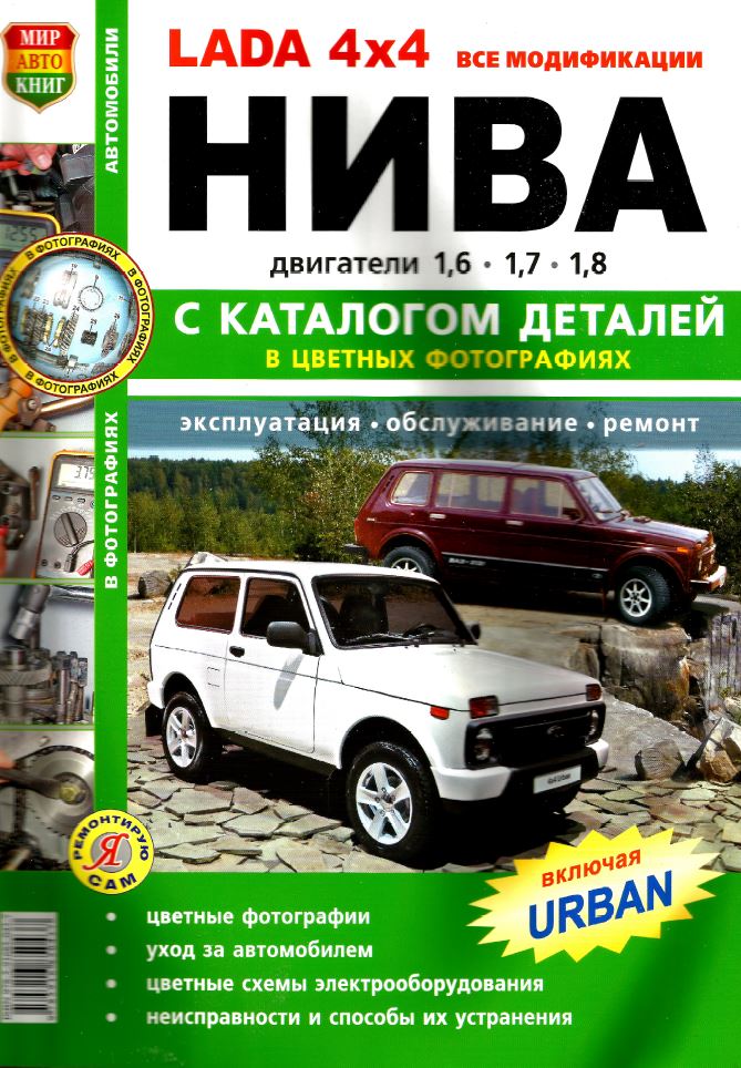 Подробное справочно-информационное цветное издание Руководство по ремонту Лада Нива, а также руководство по эксплуатации и техническому обслуживанию, устройство Лада Нива, Лада Нива Урбан всех модификаций, каталог запчастей Лада Нива, оборудованных бензиновыми двигателями рабочим объемом 1,6, 1,7 и 1,8 л. Ремонт Lada Niva Urban. Электрические схемы. Эксплуатация и ТО.