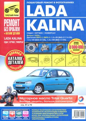 Цветное справочно-информационное издание руководство по ремонту Лада Калина, устройство Лада Калина, руководство по техническому обслуживанию и эксплуатации автомобилей Lada Kalina и модификаций, каталог запчастей Лада Калина, каталог деталей и сборочных единиц Лада Калина с двигателями ВАЗ 21114-50, ВАЗ 21126 рабочим объемом 1,6 л. и ВАЗ 11194 рабочим объемом 1,4 л. в кузове седан, хетчбек и универсал. Ремонт узлов и агрегатов Лада Калина. Эксплуатация. Техобслуживание. Схемы электрооборудования.