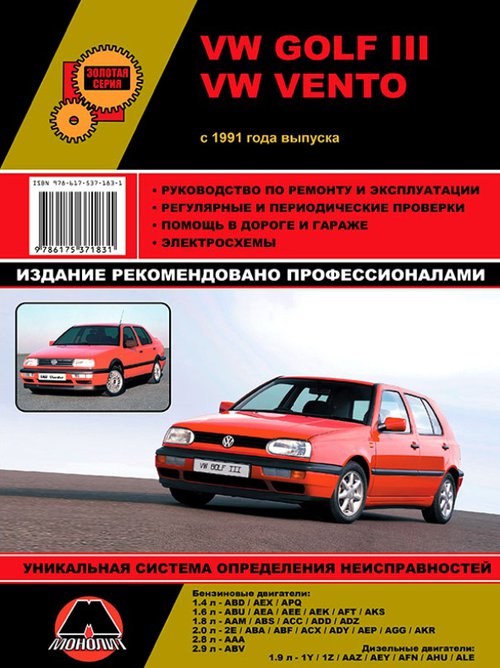 Книга по ремонту Volkswagen Golf 3 / Volkswagen Vento, а также инструкция по техническому обслуживанию и эксплуатации автомобилей Фольксваген Гольф 3 / Фольксваген Венто с 1991 года выпуска. Модели VW Golf 3 / VW Vento оборудованы бензиновыми двигателями рабочим объемом 1,4 л – ABD / AEX / APQ; 1,6 л. – ABU / AEA / AEE / AEK / AFT / AKS; 1,8 л. – AAM/ ABS / ACC / ADD / ADZ; 2,0 л. – 2E / ABA / ABF / ACX / ADY / AEP / AGG / AKR, 2,8 л. – AAA; 2,9 л. – ABV, а также дизельными двигателями рабочим объемом 1.9 л. – 1Y / 1Z / AAZ / AEY / AFN / AHU / ALE. Ремонт узлов и агрегатов. Эксплуатация, обслуживание, электрические схемы.