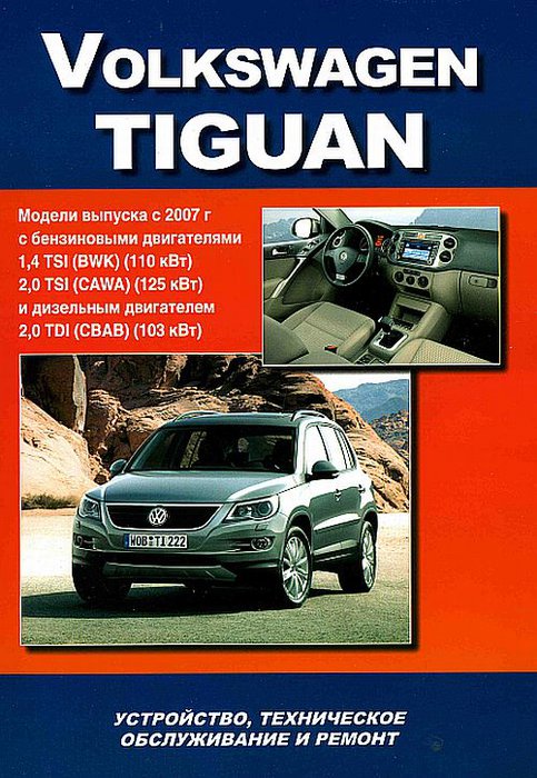 Иллюстрированное пошаговое справочно-информационное издание книга по ремонту Volkswagen Tiguan, а также руководство по техническому обслуживанию и эксплуатации Volkswagen Tiguan, устройство Volkswagen Tiguan с 2007 г. выпуска, оборудованных бензиновыми силовыми агрегатами 1,4TSI (BWK) (110 кВт), 2,0 TSI (CAWA) (125 кВт) и дизельным двигателем 2,0 TDI Common Rail (СВАВ) (125 кВт). Ремонт Фольксваген Тигуан. Устройство. Техническое обслуживание.
