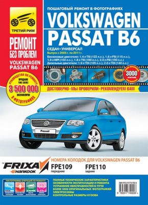 Справочно-информационное с многочисленными уникальными цветными иллюстрациями руководство по ремонту Volkswagen Passat B6,, а также подробное руководство по эксплуатации и техническому обслуживанию Фольксваген Пассат В6, устройство Volkswagen Passat B6 с 2005 по 2011 года выпуска в кузовах седан и универсал. Модель Фольксваген Пассат В6 оснащена бензиновыми двигателями TSI (1,4 л., 122 л.с.), FSI (1,6 л., 115 л.с.), MPI (1,6 л., 102 л.с.), TSI (1,8 л., 160 л.с.), FSI (2,0 л., 150 л.с.), а также дизелями TDI (1,9 л., 105 л.с.), TDI (2,0 л., 140 л.с.).