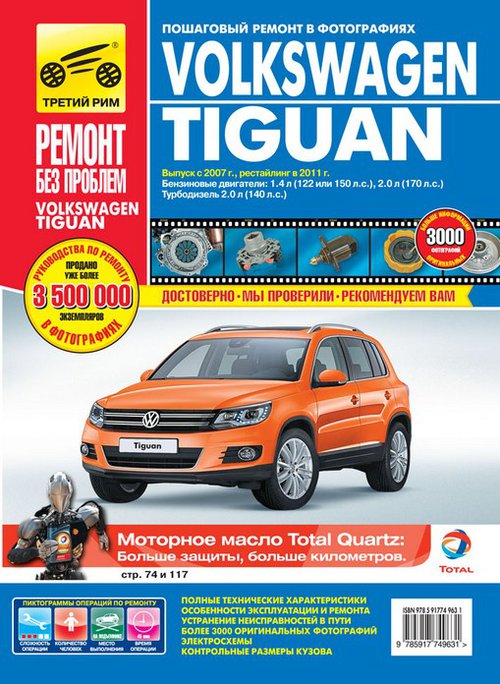 В мануал включено более 3000 фирменных фотографий от популярнейшего в нашей стране ИД технической литературы Третий Рим (все фото цветные), в подробностях и максимально наглядно показывающих многоступенчатый процесс ведения пошагового ремонта автомобиля VW Tiguan, в том числе рассмотрен ремонт силовых агрегатов этой популярной модели, представлены исчерпывающие технические характеристики Фольксваген Тигуан, даны перечни возможных поломок/неполадок автомобиля и рекомендации профессионалов по их обнаружению и ликвидации. Изучены нюансы ремонта и эксплуатации конкретно этой модели автомобиля.
