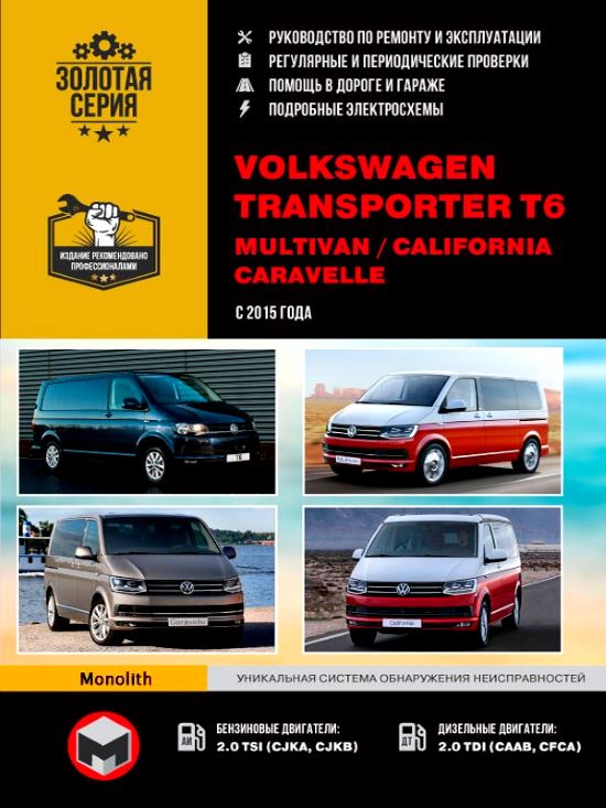 Руководство по ремонту и эксплуатации Volkswagen Transporter / Caravelle / Multivan / California (кузов T6) шестого поколения. В электронной книге рассмотрены автомобили 2015 – 2019 года выпуска.