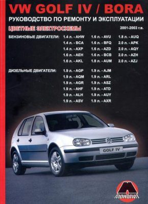 Справочная книга Руководство по ремонту VW Bora, Volkswagen Golf 4, эксплуатации и техническому обслуживанию, устройство VW Bora, Volkswagen Golf 4 2001-2003 гг. выпуска, оборудованных бензиновыми двигателями AHV, BCA, AXP, рабочим объемом 1,4 л., AEH, AKL, AVU, BFQ, AZD, BCB, рабочим объемом 1,6 л., AUM, AUQ рабочим объемом 1,8 л., APK, AQY, AZH, AZJ рабочим объемом 2,0 л., а также дизельными двигателями AGP, AQM, AGR, AHF, ALH, ASV, AJM, ARL, ASZ, ATD, AUY, AXR рабочим объемом 1,9 л.
