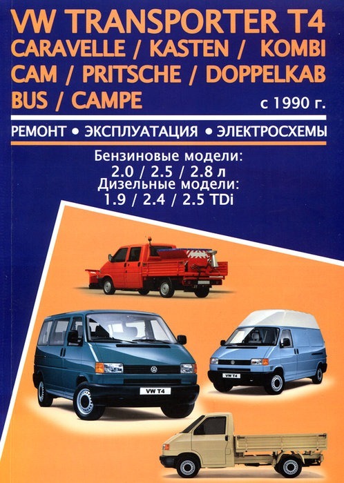 Справочное иллюстрированное издание руководство по обслуживанию Volkswagen Caravelle / Volkswagen Transporter T4 / Volkswagen Kasten / Volkswagen Kombi / Volkswagen Cam / Volkswagen Pritsche / Volkswagen Doppelkab Bus / Volkswagen Campe, устройство, руководство по эксплуатации и техническому обслуживанию Volkswagen Caravelle / Transporter T4 / Kasten / Kombi / Cam / Pritsche / Doppelkab Bus / Campe, с 1990 года выпуска, оборудованных бензиновыми двигателями литражом 2,0, 2,5, 2,8, а также дизелями литражом 1,9, 2,4, 2,5 TDi.