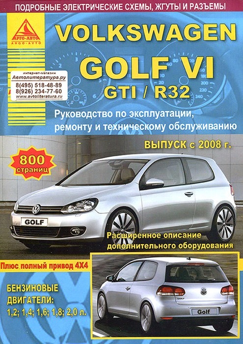 Справочно-информационное подробнейшее пособие книга по ремонту Volkswagen Golf 6 / Volkswagen Golf GTI / Volkswagen Golf R32, а также руководство по эксплуатации и техническому обслуживанию Volkswagen Golf 6, устройство автомобилей Volkswagen Golf 6 с 2008 г. выпуска, включая модели с полным приводом, оборудованных бензиновыми силовыми агрегатами рабочим объемом 1,2, 1,4, 1,6, 1,8, 2,0 л.
