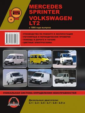 Справочное иллюстрированное издание Руководство по обслуживанию VW LT2 / Mercedes Sprinter, устройство, руководство по эксплуатации и инструкции по ремонту VW LT2 / Mercedes Sprinter, которые выпускаются с 1995 года и оборудуются дизельными двигателями литражом 2,1, 2,3, 2,5, 2,7, 2,8, 2,9.