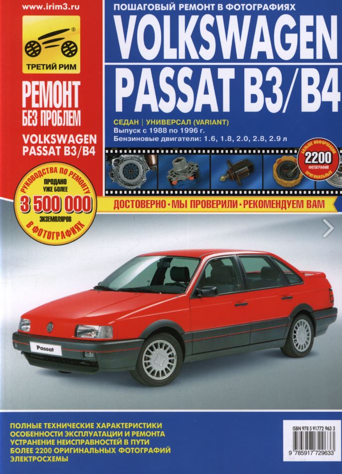 Цветное руководство по ремонту Фольксваген Пассат B3 / B4 1988-1996 гг. выпуска, оборудованных бензиновыми двигателями рабочим объемом 1,6, 1,8, 2,0, 2,8, 2,9 л., инструкция по эксплуатации Volkswagen Passat, книга по техническому обслуживанию и устройству. Ремонгт Фольксваген В3 В4. Инструкция по эксплуатации. Цветные фото. Схемы электрооборудования