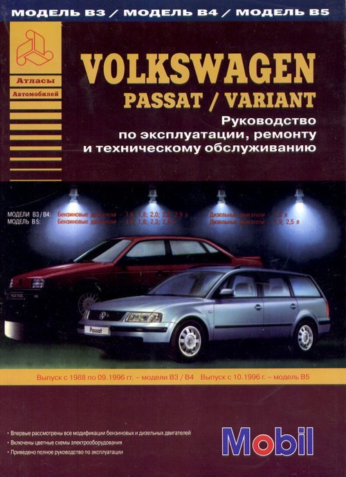 Руководство по ремонту, эксплуатации и техническому обслуживанию автомобилей Volkswagen Passat / Variant с 1988 по 09.1996 гг. – модели B3/B4, оборудованных бензиновыми двигателями рабочим объемом 1,6, 1,8, 2,0, 2,8, 2,9 л. и дизельными двигателями рабочим объемом 1,9 л.; а также выпуск автомобилей Volkswagen Passat / Variant с 10.1996 г. – модель B5, оборудованных бензиновыми двигателями рабочим объемом 1,6, 1,8, 2,3, 2,8 л. и дизельными двигателями рабочим объемом 1,9, 2,5 л.